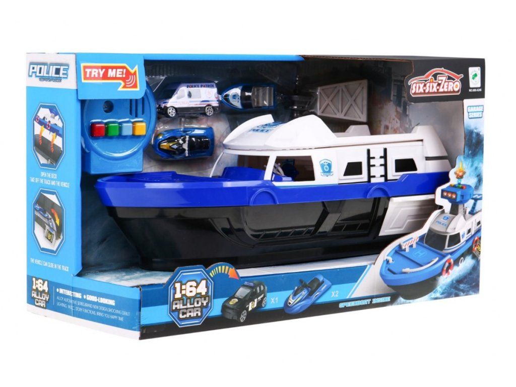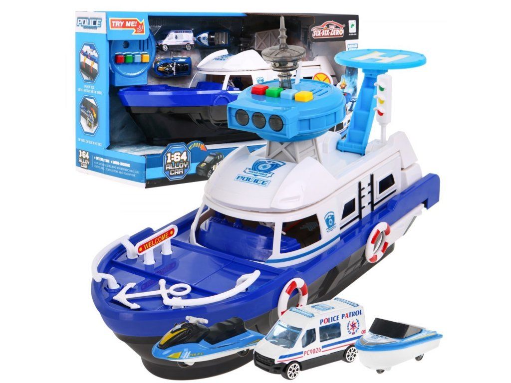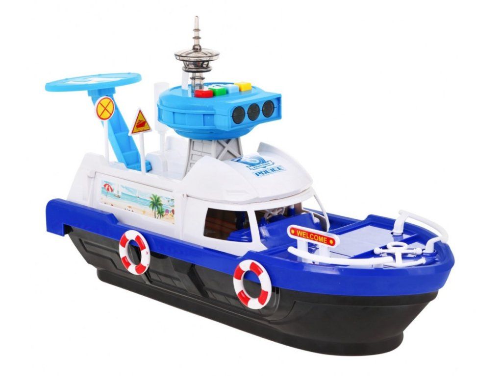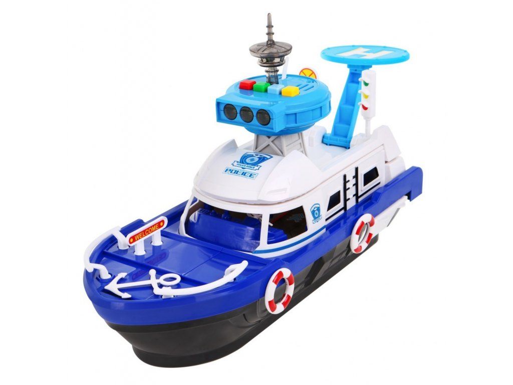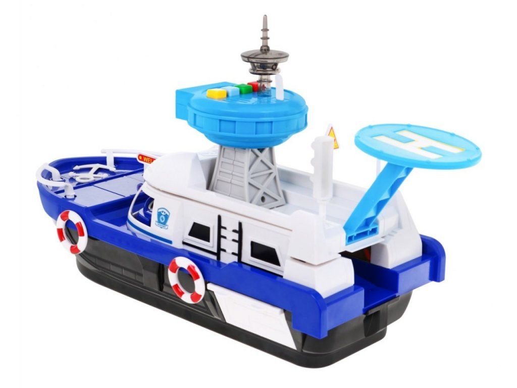 Policajná loď na batérie Police Boat je ideálnou hračkou každého malého námorníka. Napomáha rozvoju manuálnej zručnosti, logického myslenia a predstavivosti. Je vybavená riadiacou vežou s tlačidlami, ktoré vydávajú rôzne zvuky a svetelné efekty. S otvorené paluby vedie do vody šmykľavka, ďalšie sú potom na bočných stranách lode. Súčasťou lode je pristávacia plocha vrtuľníka, malé policajné autíčko, motorový čln a vodný skúter. Hračka je určená pre deti od 36 mesiacov veku.