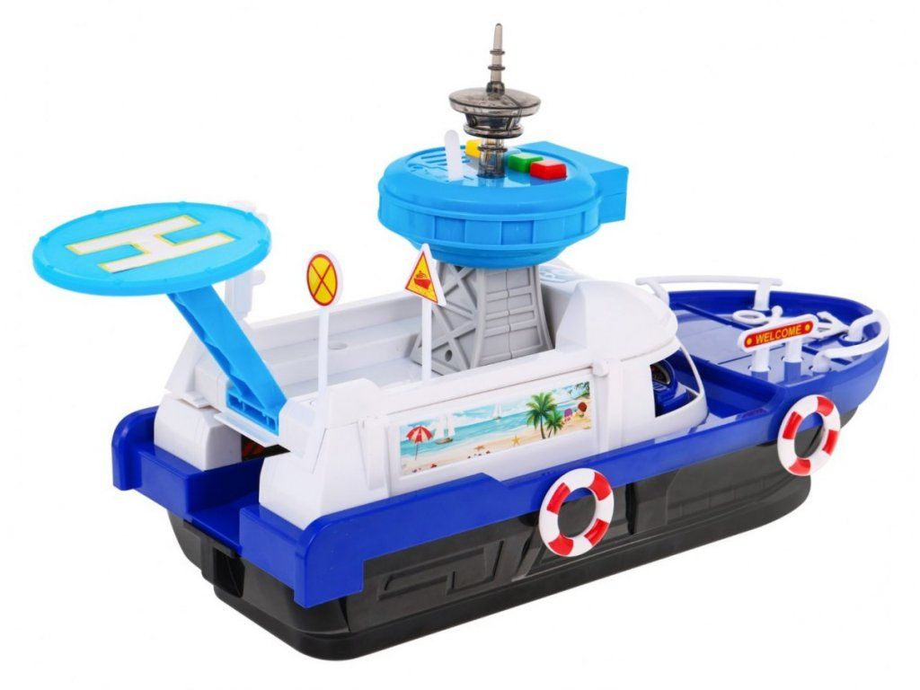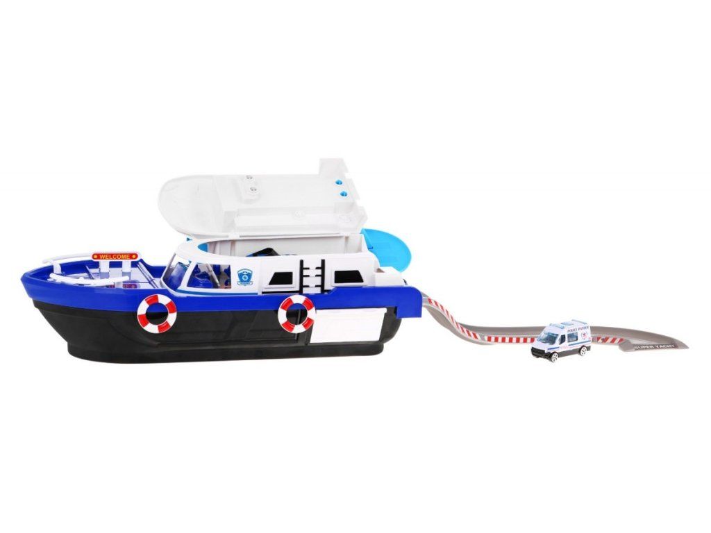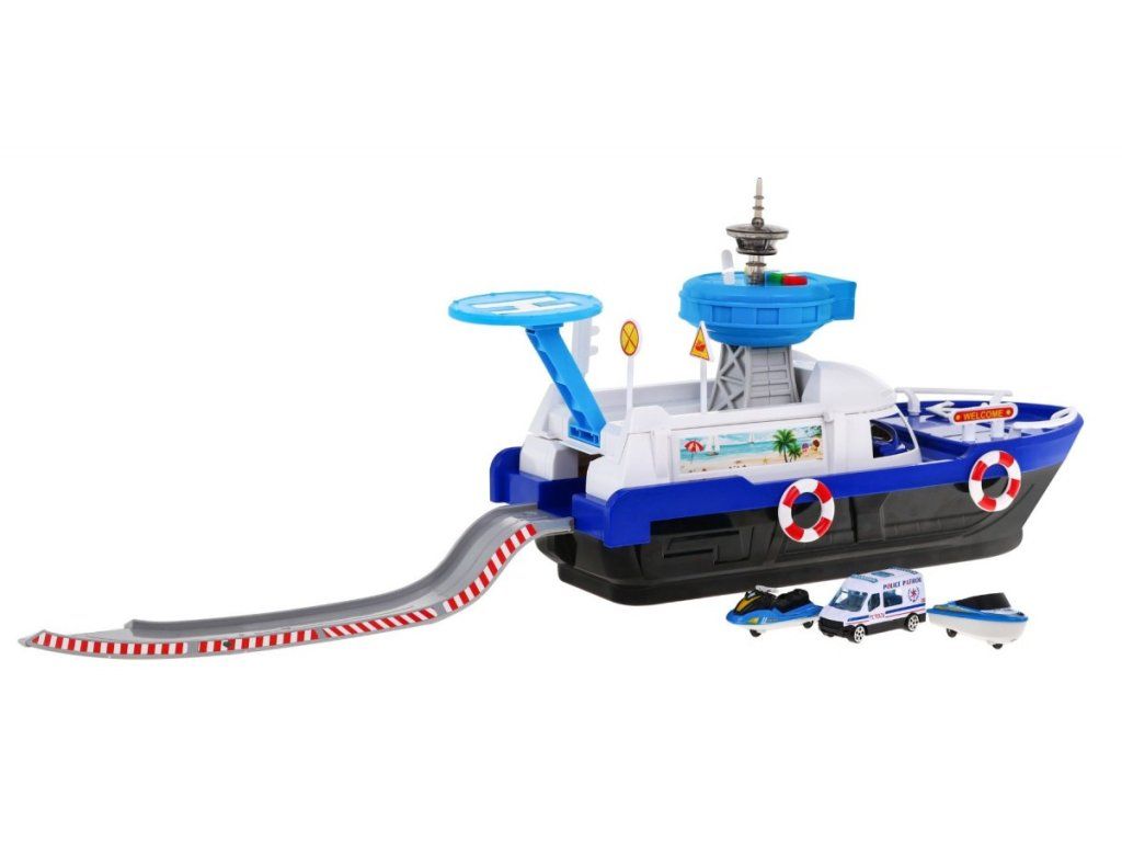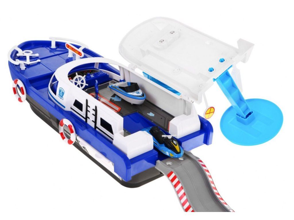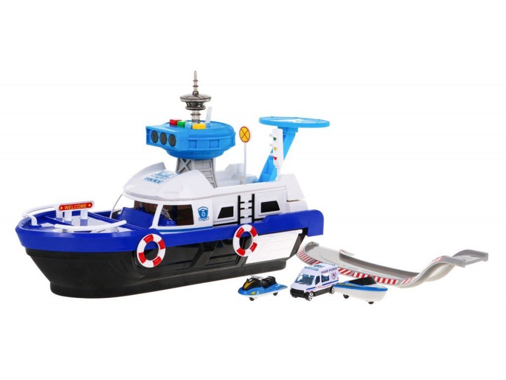 Policajná loď na batérie Police Boat je ideálnou hračkou každého malého námorníka. Napomáha rozvoju manuálnej zručnosti, logického myslenia a predstavivosti. Je vybavená riadiacou vežou s tlačidlami, ktoré vydávajú rôzne zvuky a svetelné efekty. S otvorené paluby vedie do vody šmykľavka, ďalšie sú potom na bočných stranách lode. Súčasťou lode je pristávacia plocha vrtuľníka, malé policajné autíčko, motorový čln a vodný skúter. Hračka je určená pre deti od 36 mesiacov veku.
