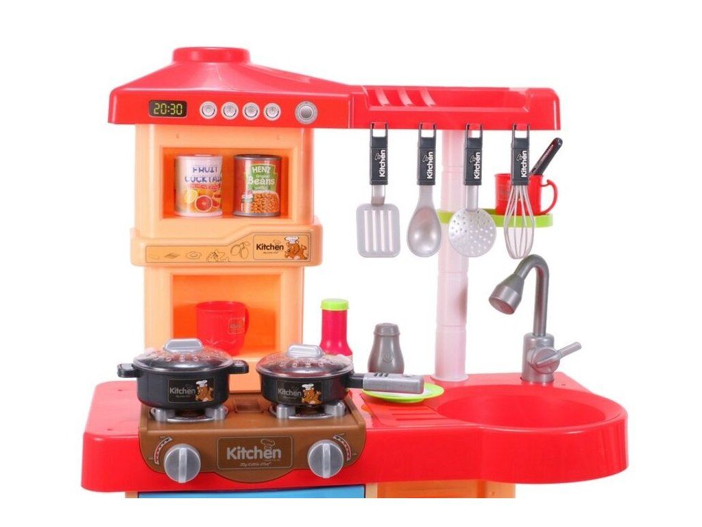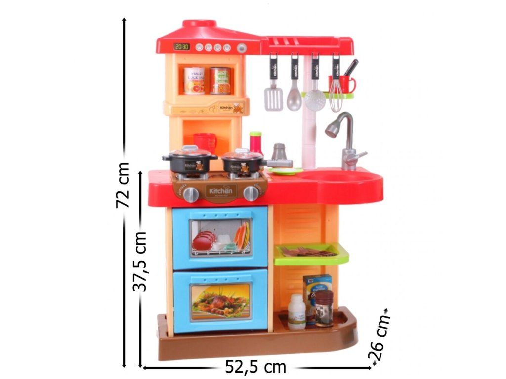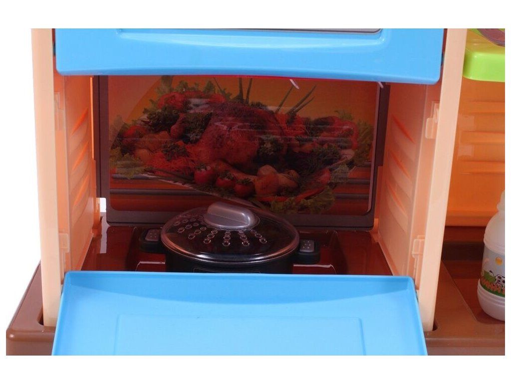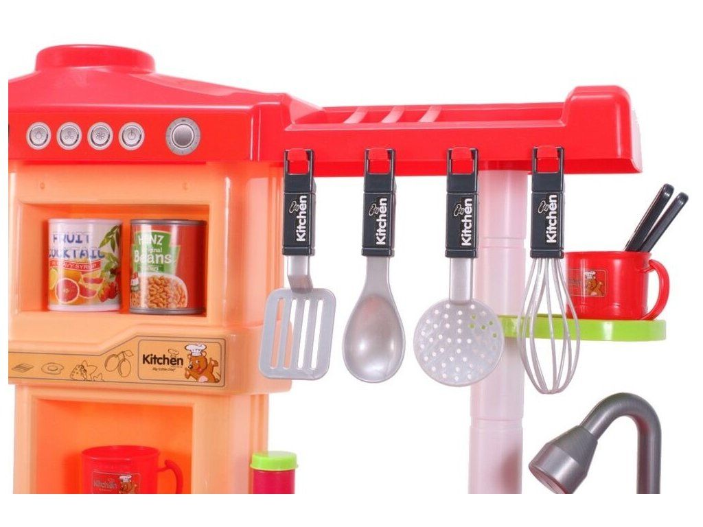 Interaktívna detská kuchynka My Little Kitchen so zvukmi, svetlom a tečúcou vodou je určená pre deti od 36 mesiacov veku. Je vybavená celkom mnohými elementmi ako sú príbory, hrnce s pokrievkou, hotové jedlá, imitácia ovocia a zeleniny a mnoho ďalších. Po naliatí vody do drezu a stlačení špeciálneho tlačidla začne tiecť voda a deti môžu umývať riad ako v reálnej kuchyni. Vaše dieťa sa určite s touto veľkou kuchynkou nudiť nebude. Rúra kuchynky je otváracia. Je vyrobená z plastu v pestrofarebnom prevedení.