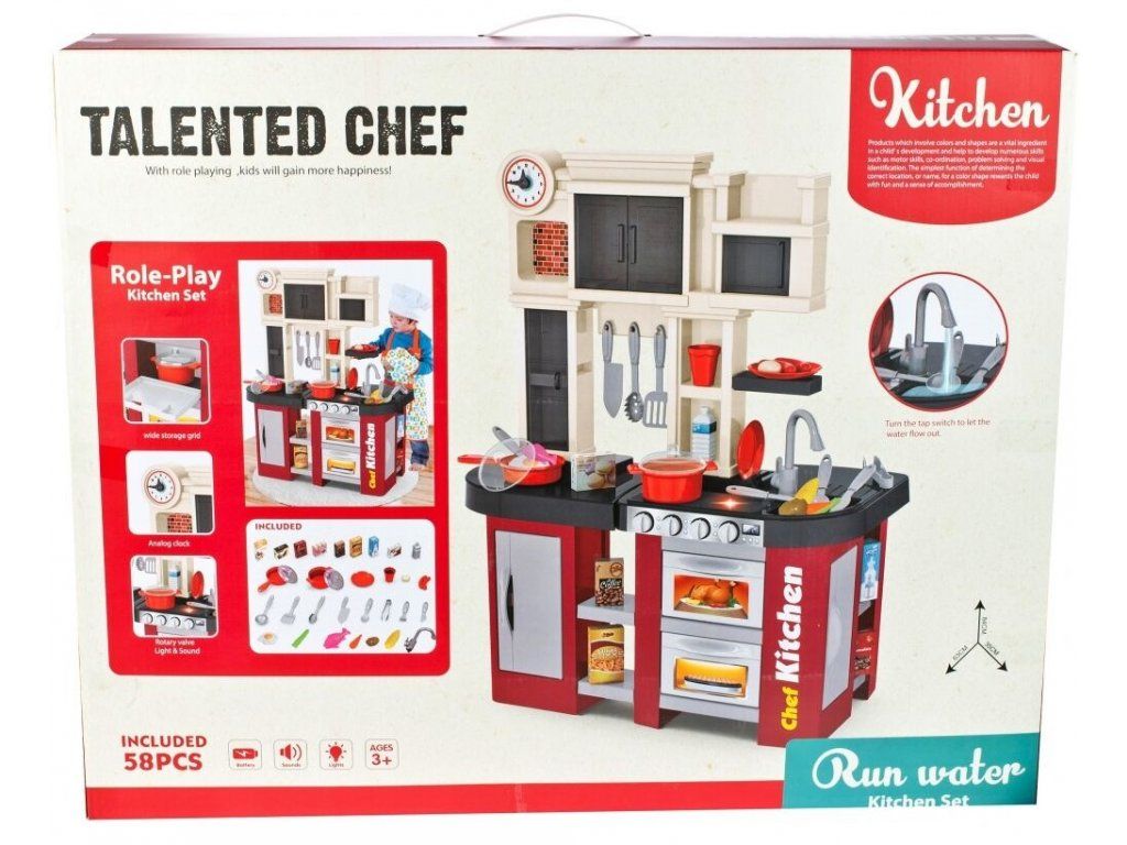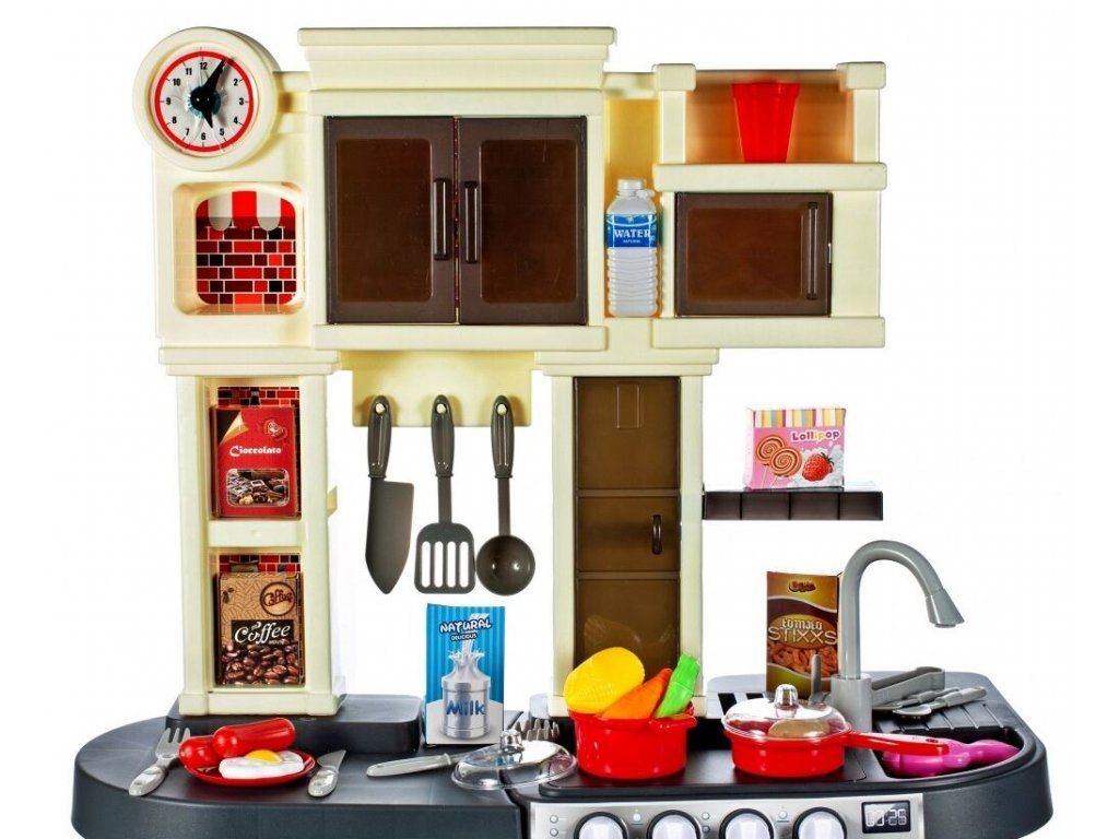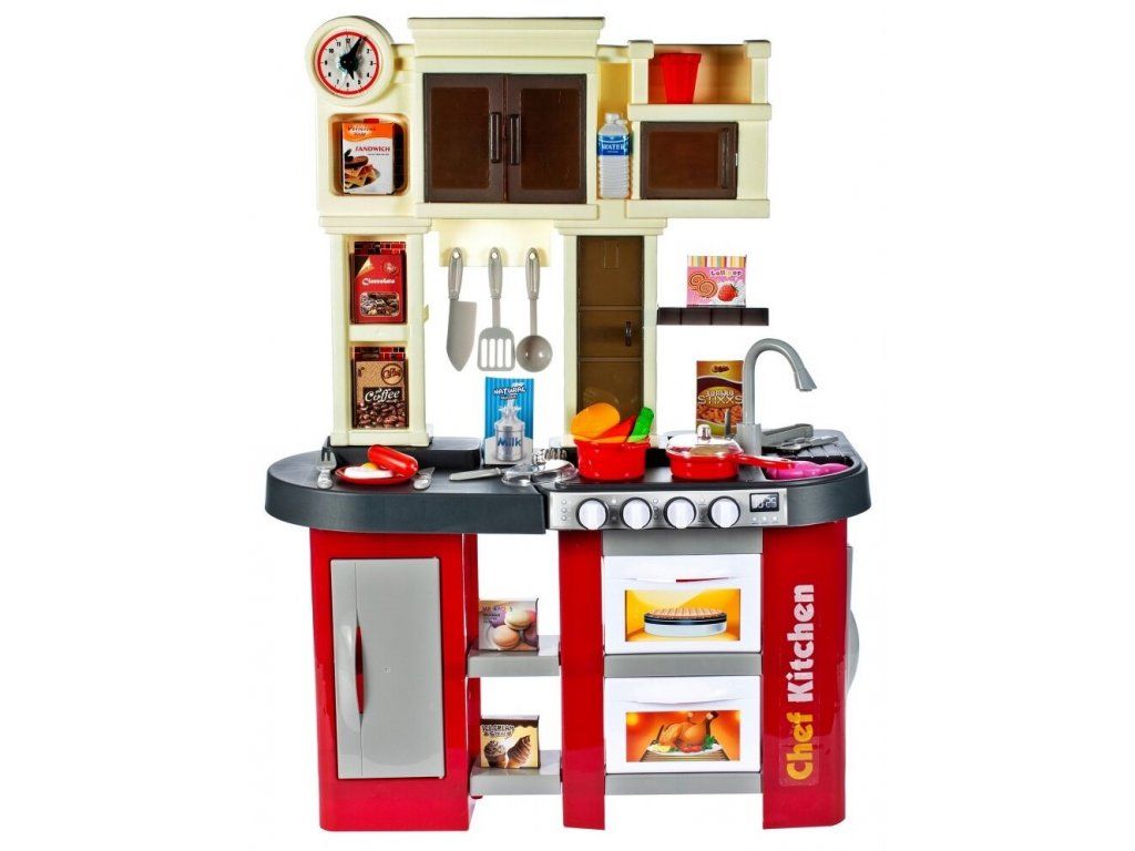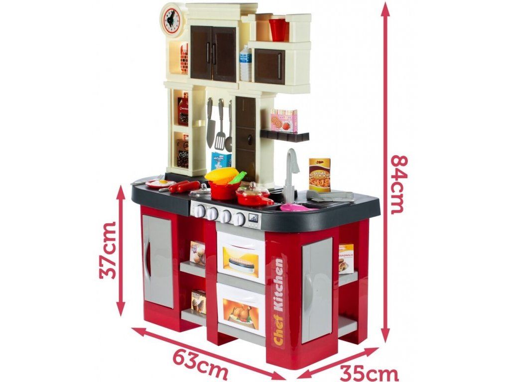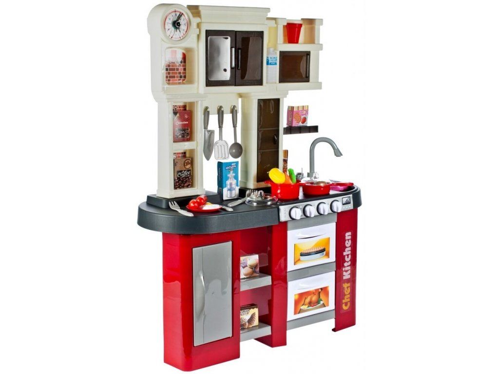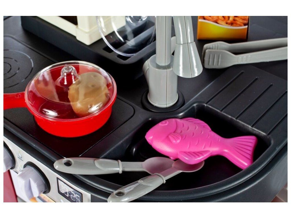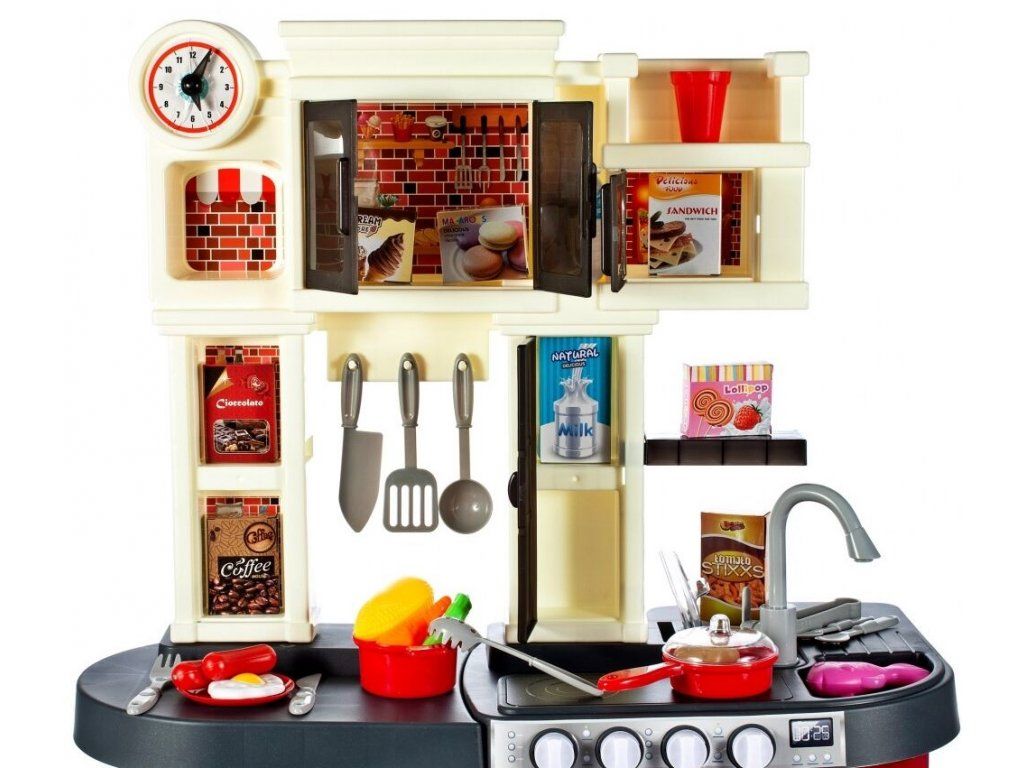 Interaktívna detská kuchynka so zvukmi, svetlom a tečúcou vodou je určená pre deti od 36 mesiacov. Je vybavená celkom 58 elementmi ako sú príbory, panvica, hotové jedlá, taniere, imitácia potravín a mnoho ďalších. Po naliatí vody do drezu a stlačení špeciálneho tlačidla začne tiecť voda a deti môžu umývať riad ako v reálnej kuchyni. Vaše dieťa sa určite s touto veľkou kuchynkou nudiť nebude. Skrinky a chladničky sú otváracie. Hodiny s posuvnými ručičkami pomôžu strážiť čas varenia. Je vyrobená z plastu v pestrofarebnom prevedení