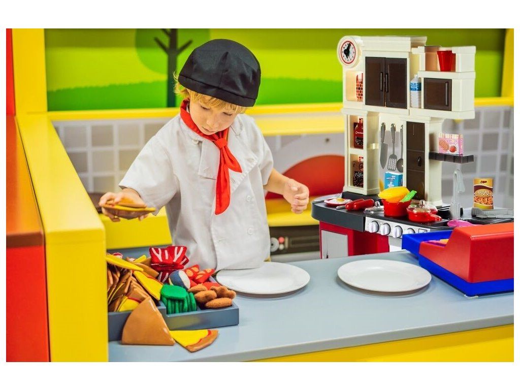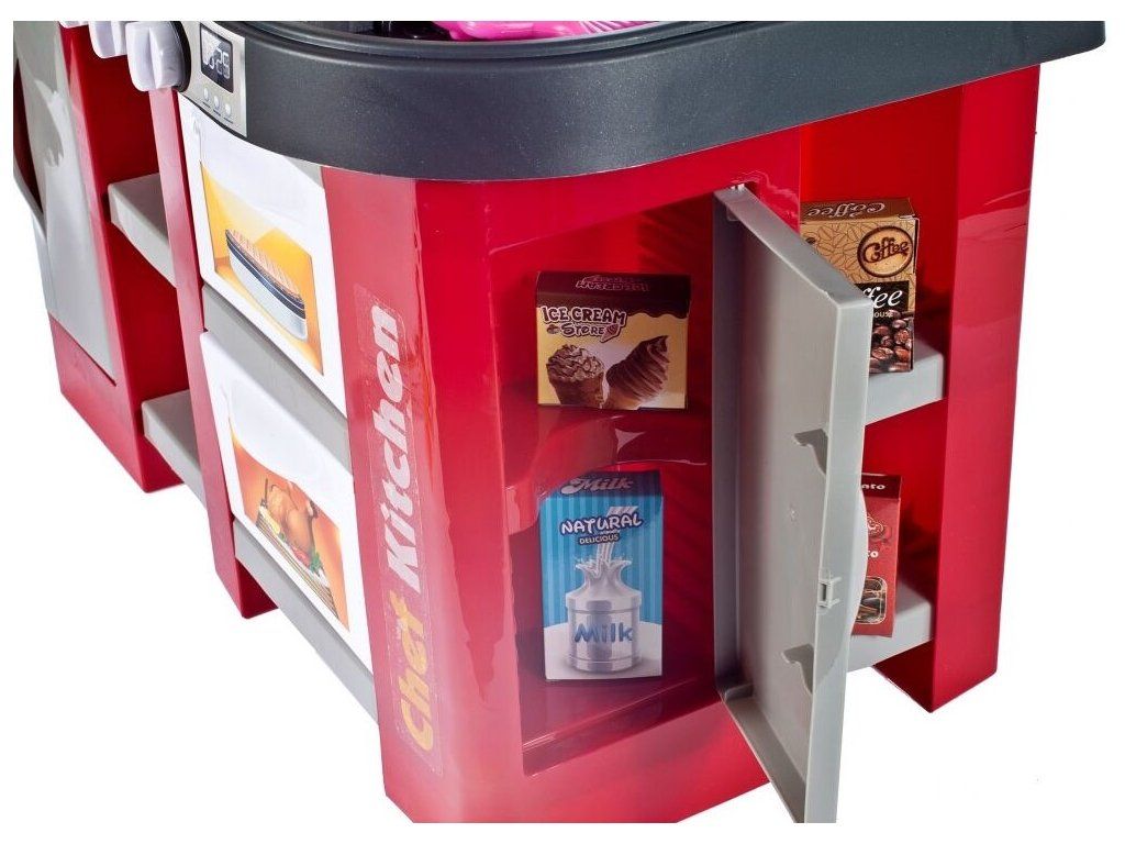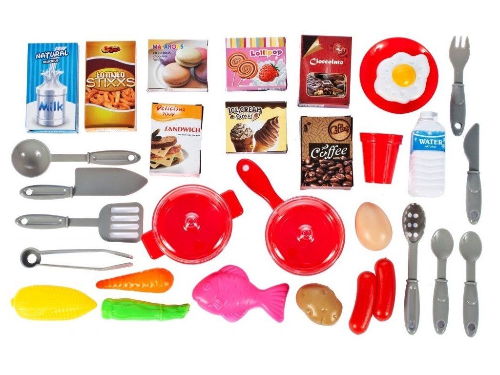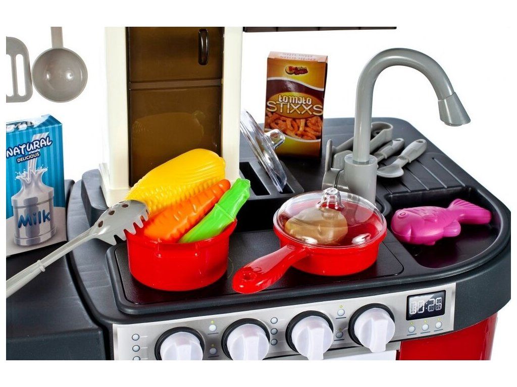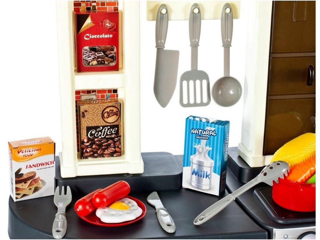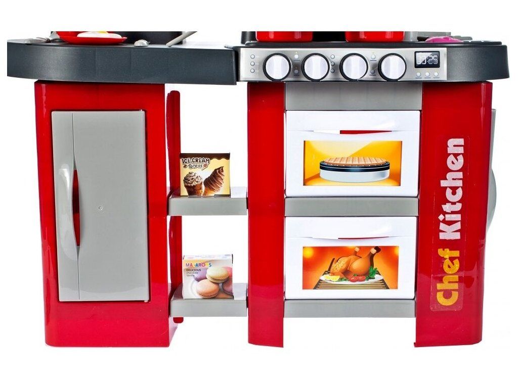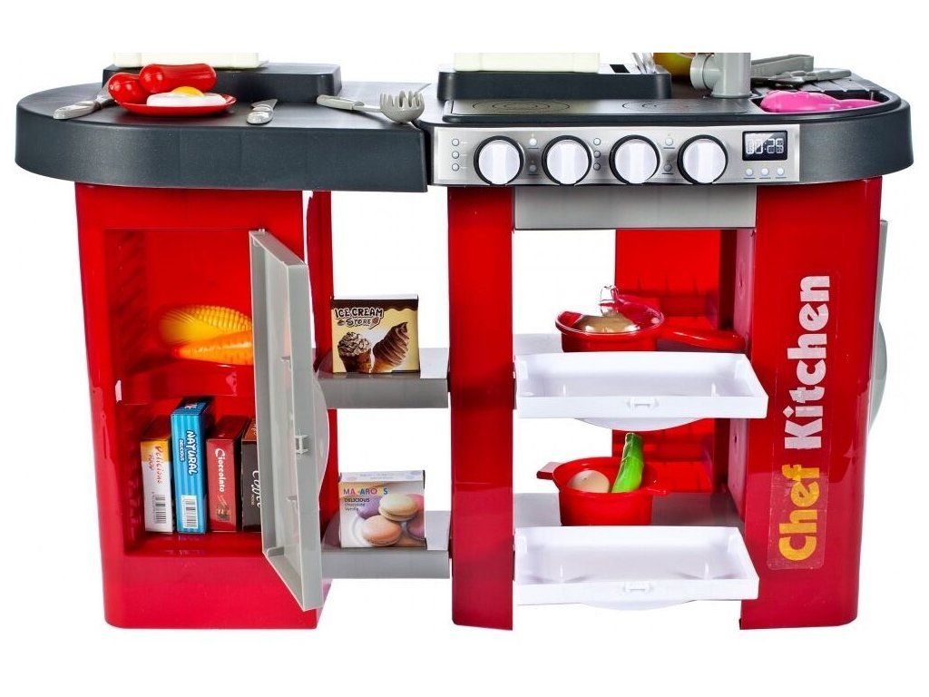 Interaktívna detská kuchynka so zvukmi, svetlom a tečúcou vodou je určená pre deti od 36 mesiacov. Je vybavená celkom 58 elementmi ako sú príbory, panvica, hotové jedlá, taniere, imitácia potravín a mnoho ďalších. Po naliatí vody do drezu a stlačení špeciálneho tlačidla začne tiecť voda a deti môžu umývať riad ako v reálnej kuchyni. Vaše dieťa sa určite s touto veľkou kuchynkou nudiť nebude. Skrinky a chladničky sú otváracie. Hodiny s posuvnými ručičkami pomôžu strážiť čas varenia. Je vyrobená z plastu v pestrofarebnom prevedení