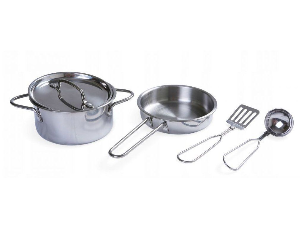 Súprava kovového riadu Ecotoys do detskej kuchynky imituje skutočný riad. Skladá sa celkom z 5 súčastí a nesmie chýbať v žiadnej detskej kuchynke, dá sa s ňou hrať aj samostatne. Nájdete tu hrniec, pokrievku, panvicu, naberačku a obracačku. Táto hračka je určená pre deti od 3 rokov .