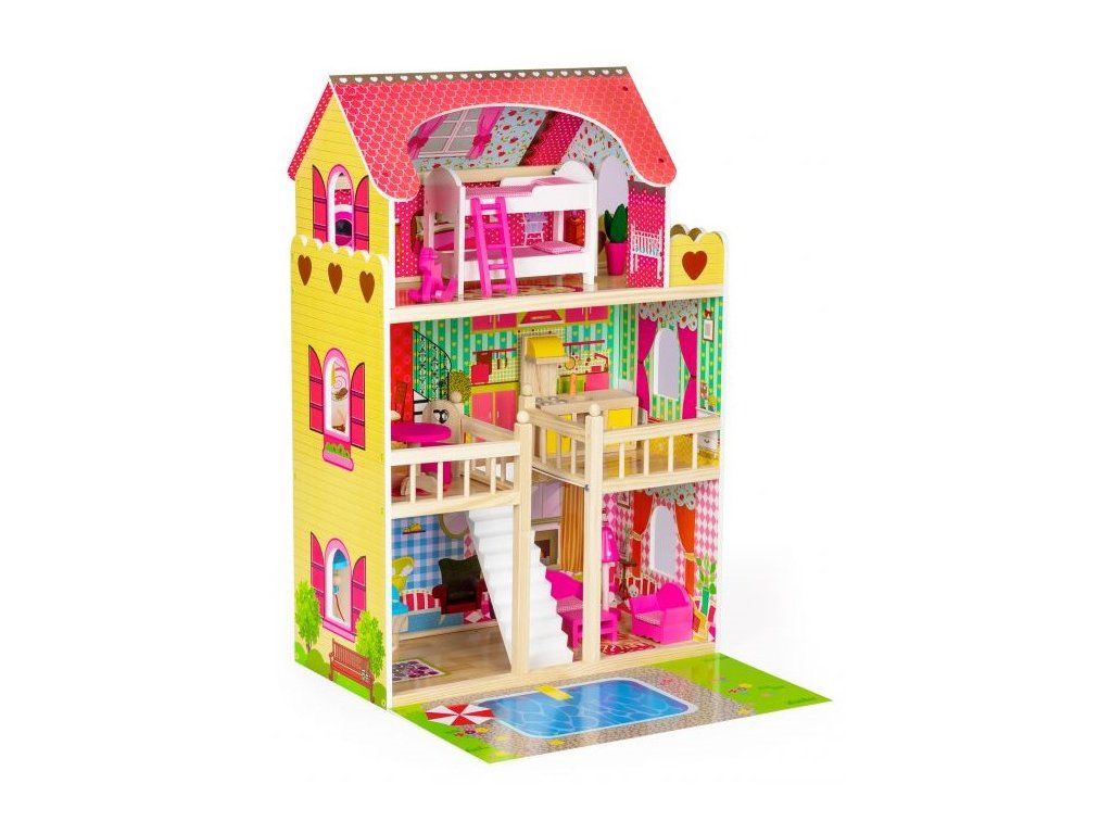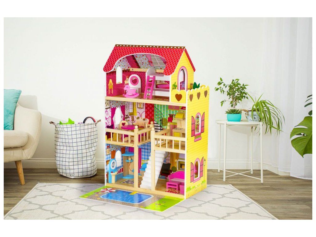 Domček pre bábiky s garážou rezidencie Rezidencia Becky má 3 nezávislé úrovne, v ktorých sú celkom 4 izby, veľká terasa a balkón-všetko imituje dokonale skutočný bytový dom. Každá izba bola dokončená v inom štýle, prispôsobená bola dekorácia a nábytok charakteru a účelu miestnosti. Súčasťou súpravy je aj sada 16 ks dreveného nábytku, ktorý je možné bez obmedzenia presúvať. Každý kus nábytku je vyrobený ručne, s veľkou pozornosťou k detailu a najvyššej kvalite prevedenia, bolo tiež dbané na odstránenie ostrých hrán, ktoré sú zásadné pre bezpečnosť Vášho dieťaťa. Domček pre bábiky je nepochybne najlepší darček, ktorý môžete dať Vášmu dieťaťu! Každé dievča sníva o takom domčeku! Rezidencia bude vyzerať dobre nielen v detskej izbe, ale aj v obývacej izbe, čo povzbudí potešenie všetkých členov domácnosti. Nemusíte sa starať o zostavenie domu - jasná príručka s obrázkami a číslovanie všetkých prvkov Vám umožní rýchlo a efektívne zostaviť dom. Je vhodný pre všetky bábiky typu Barbie do výšky 24 cm.