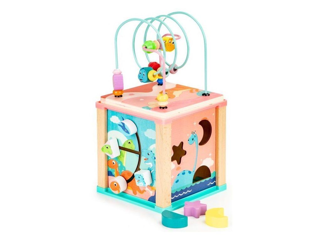 Drevená edukačná kocka Dino Cube 5v1. Na hornom odnímateľnom kryte je umiestnená kovová konštrukcia s korálkami, ktoré sa môžu ľubovoľne presúvať. Na bočných stenách sú umiestnené otáčacie ozubené kolieska, hodiny s otočnými ručičkami, vhadzovacie otvory a labirynt s dinosaurami. Vnútorný priestor môže slúžiť na úschovu hračiek. Kocka je ideálnou hračkou pre rozvoj detskej motoriky, hmatu, zraku a logického myslenia. Hračka je určená pre deti od 18 mesiacov veku.