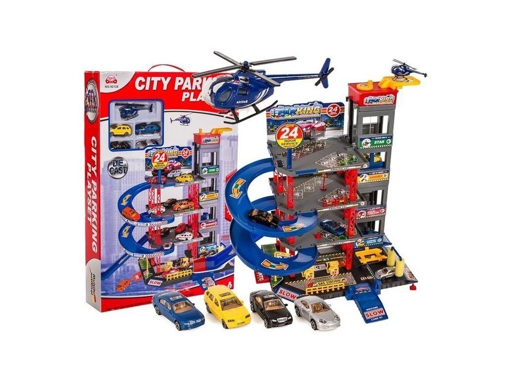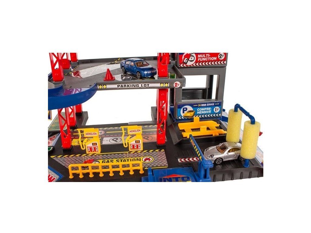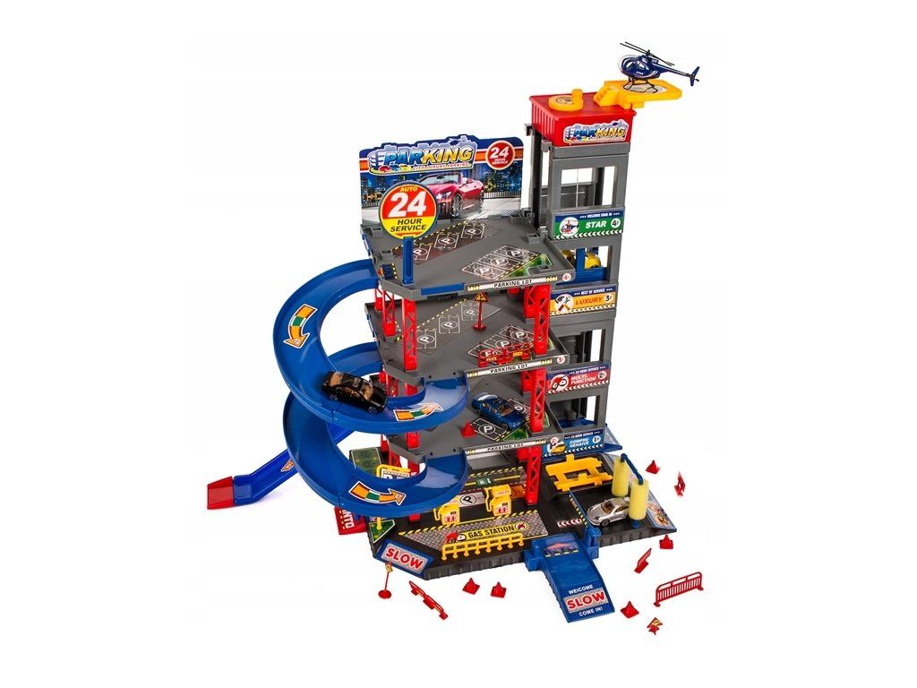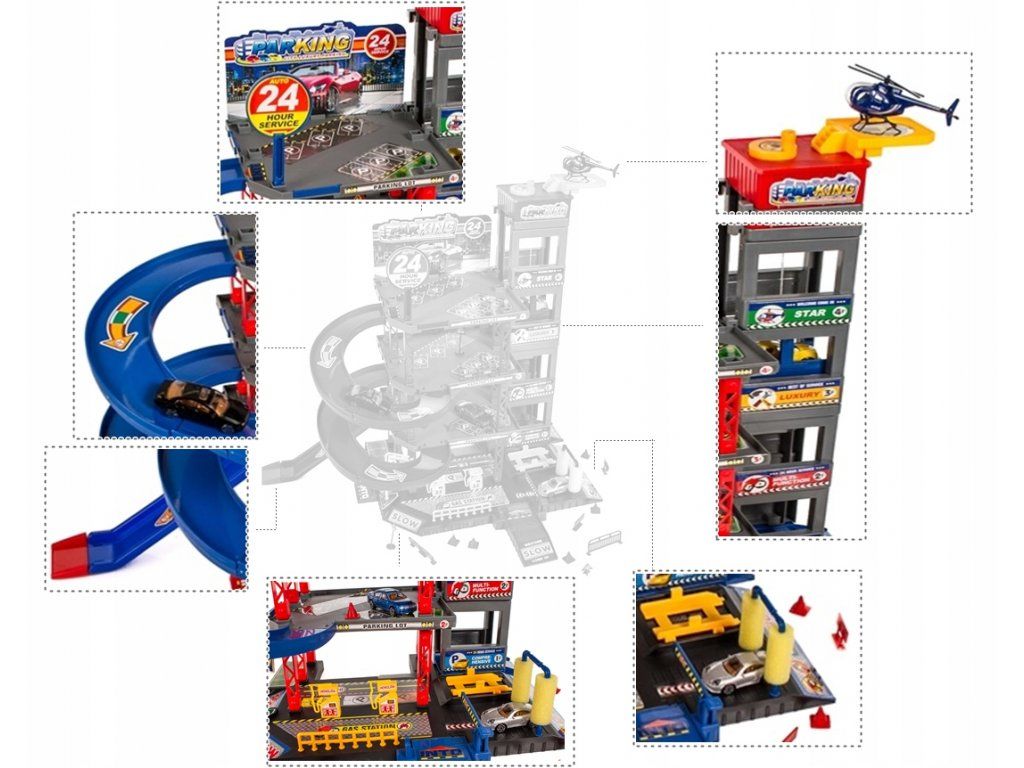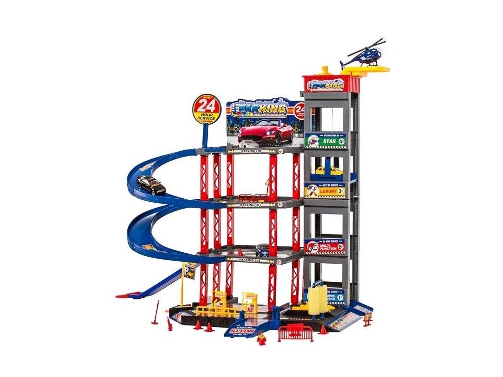 Detská poschodová garáž so 4 kovovými autíčkami a vrtuľníkom. Súčasťou parkoviska je pohyblivý výťah, ktorý umožňuje presúvať autíčka medzi jednotlivými poschodiami, pouličné osvetlenie, benzínová pumpa, pristávacia plocha vrtuľníka a dopravné značky. Jednotlivé poschodia sú prepojené špirálovitou dráhou. Mladý nadšenec tu nájde všetko čo potrebuje. Vyrobená z veľmi kvalitného materiálu bez ostrých hrán.