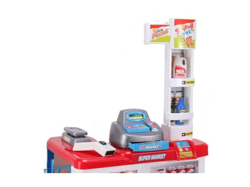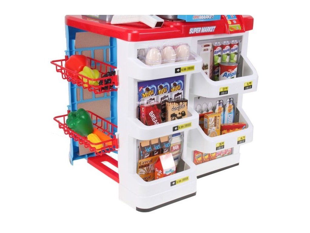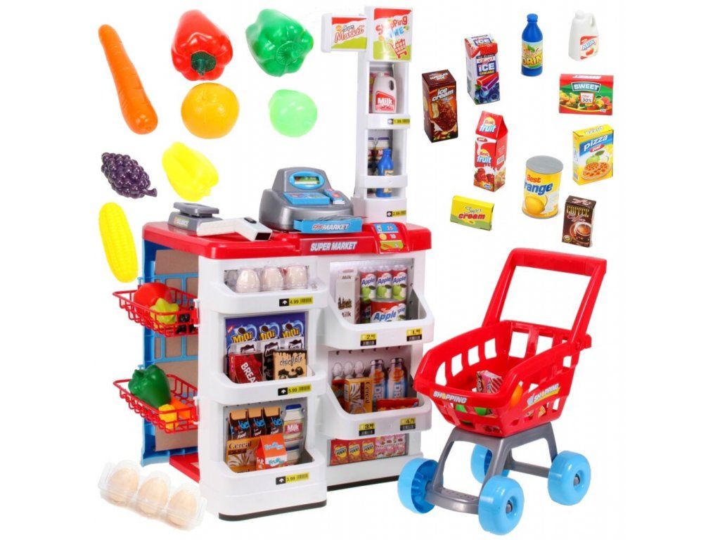 Detský obchodík Ecotoys s nákupným vozíčkom premení Vaše dieťa na skutočného predavača. Je vybavený všetkým dôležitým čo taký malý obchodník potrebuje. Nájdete tu pokladňu s tlačidlami, váhu, čítačku čiarových kódov, ktorá svieti a vydáva charakteristický zvuk, imitácia ovocia a zeleniny, bankovky a tiež rôzne balenia potravín. Obchodík má samozrejme police, kde môže byť všetko prehľadne vystavené. Hračka je určená pre deti od 36 mesiacov .