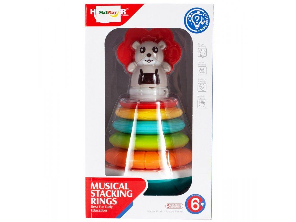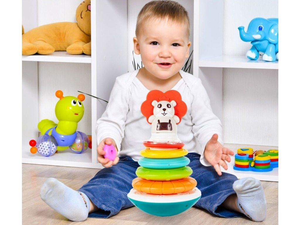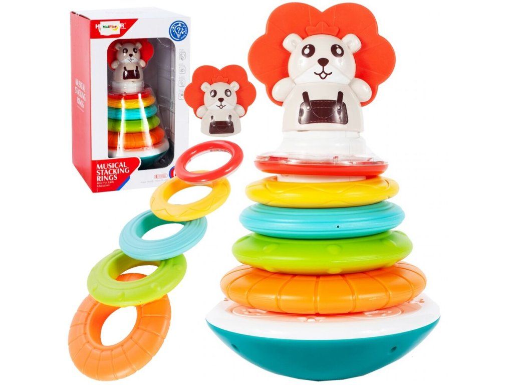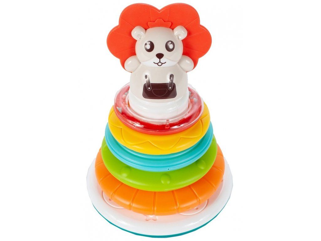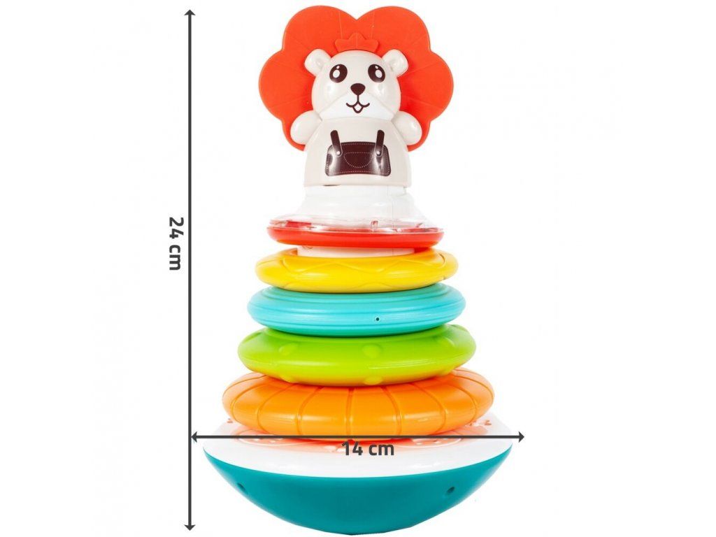 Interaktívna detská pyramída Levíček so zvukmi je určená pre deti od 6 mesiacov. Veľa farieb a tvarov stimuluje zrakové podnety u dieťaťa, správne rozvíja kognitívnu motoriku. Pri nasadzovaní obruče vychádzajú z hračky rôzne zvuky a po stlačení tlačidla sa ozývajú krátke melódie a zvuky zvieratiek. Vďaka takej zábave si batoľa trénuje manuálnu zručnosť, logické myslenie alebo rozlišovanie farieb. Skvelá hračka, ktorá "rastie" s Vaším dieťaťom.