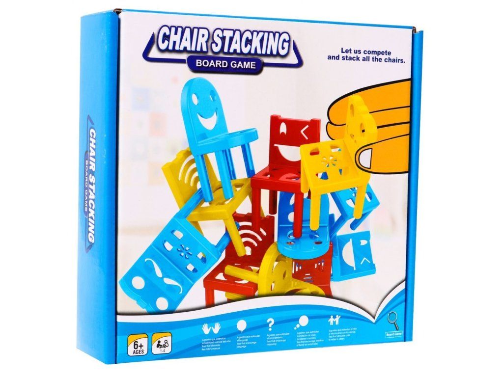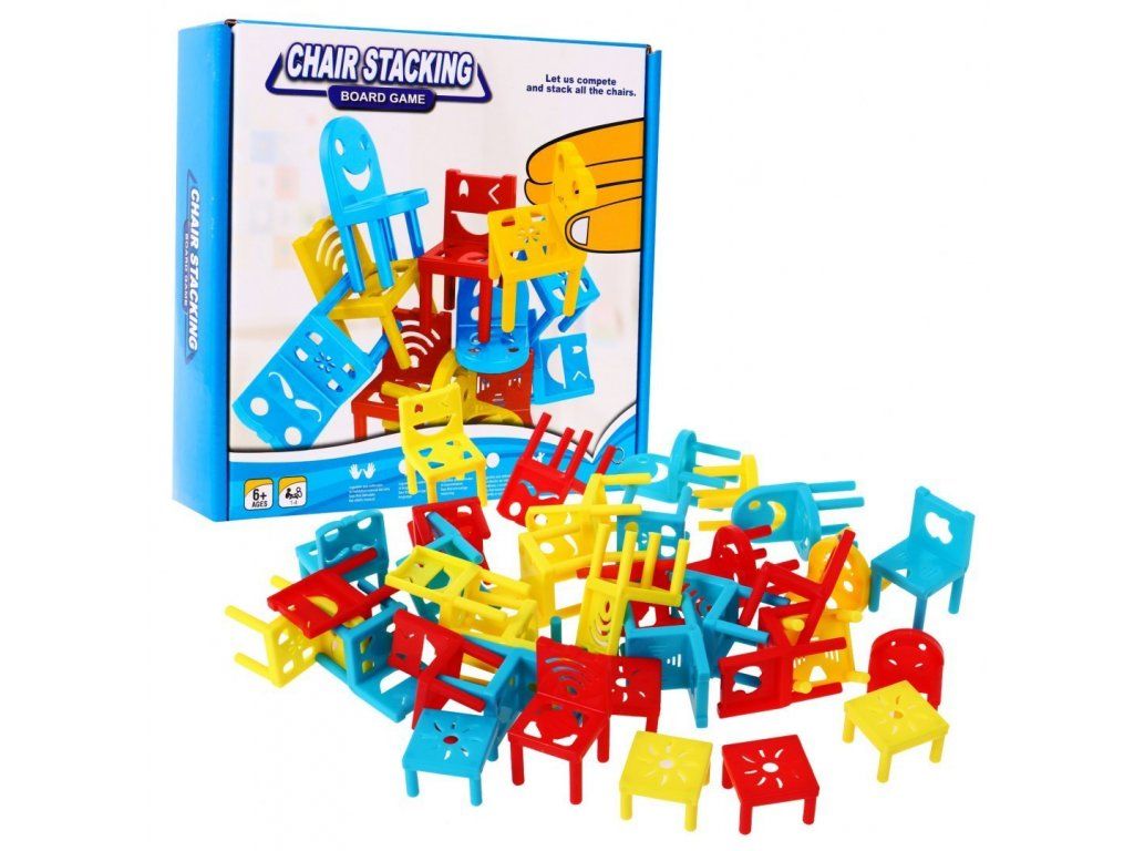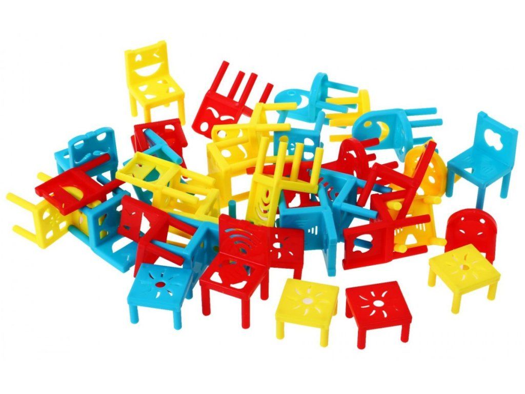 Detská dovednostná hra Veselé stoličky je určená pre deti a pokojne aj pre dospelých. Rozvíja obratnosť, koncentráciu a trpezlivosť. Zmyslom hry postaviť kompletnú vežu a využiť pri tom všetky súčasti hry. Dôležité je nedotýkať sa už postavených stoličiek. Vyhráva ten kto ako posledný umiestni posledná stoličku do veže bez toho aby spadla. Hračka je vyrobená z plastu a určená pre deti od 6 rokov.